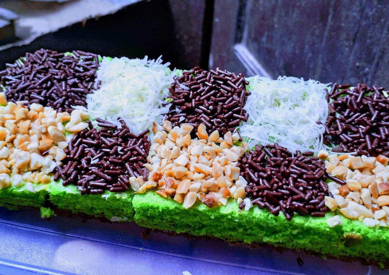 - Bagi menjadi 2 adonan sama banyak beri masing2 pasta pandan dan pasta dark coklat