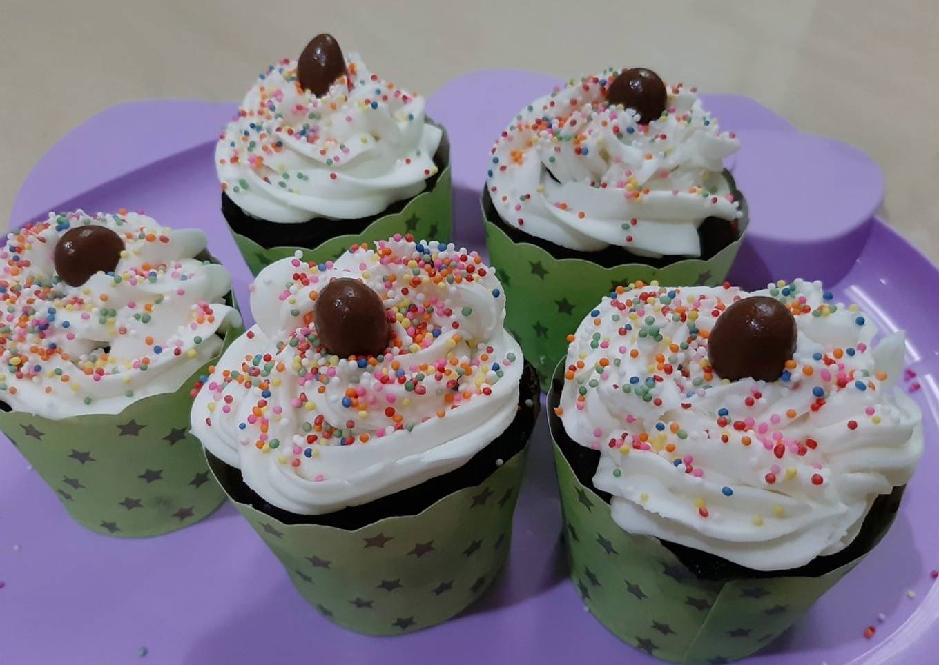 - Hias brownies cupcakes dengan butter cream, taburi dengan sprinkles dan choco ball. Sajikan.