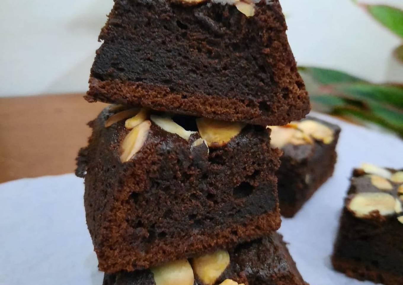 - Tuang ke dalam loyang 22×22 yg sudah di oles tipis margarin dan di alasi kertas kue. Taburi bahan taburan, saya pakai almond