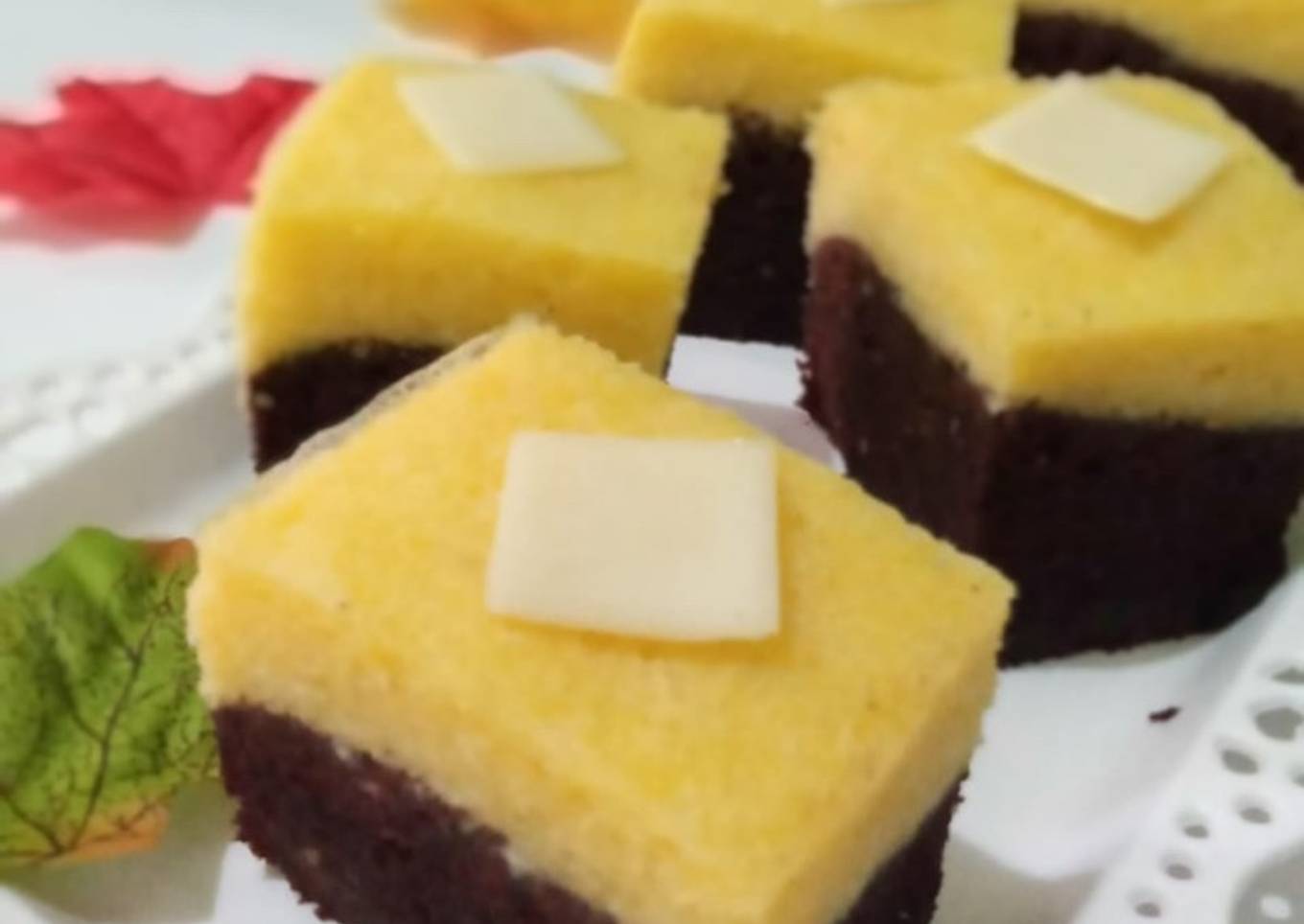- Untuk satu bagian adonan lagi tambahkan keju, aduk rata. Setelah 10 menit, masukkan adonan keju di atas adonan coklat, kukus kembali selama 15-20 menit. Angkat, dinginkan sampai suhu ruang.